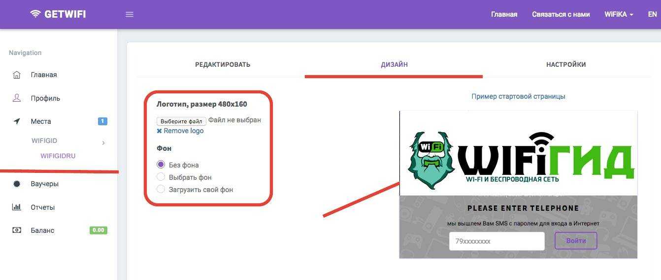 Сохраняемся и в основном меню выбираем наш новый хотспот, чтобы его отредактировать во вкладке «Дизайн». Здесь можно выбрать один из предложенных фонов для окна ввода номера телефона или загрузить свое изображение. А также добавить фирменный логотип.