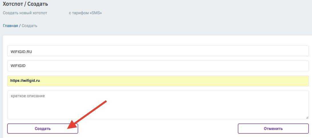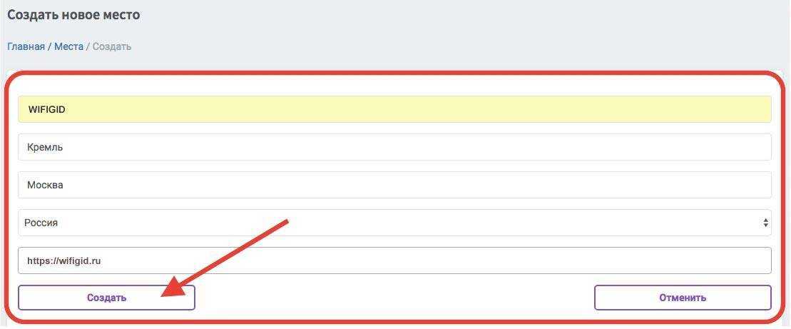 Тут мы указываем адресные данные своего заведения, где будет бесплатный вай-фай с идентификацией через SMS.