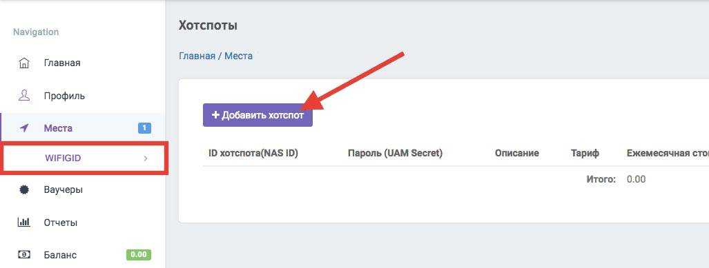 На следующем шаге выбираем в меню наше «место» и жмем на кнопку «Добавить хотспот». То есть для каждого кафе или офиса мы можем создать сразу несколько отдельных точек доступа с авторизацией при помощи SMS.