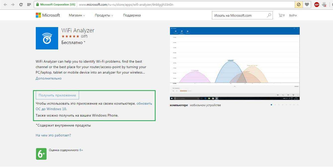 После этого на том же месте будет доступна кнопка «Получить приложение». Таким образом, установить Wifi Analyzer для Windows 7 и более ранних версий просто невозможно.