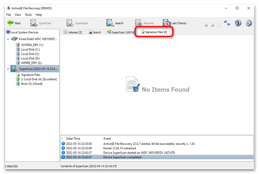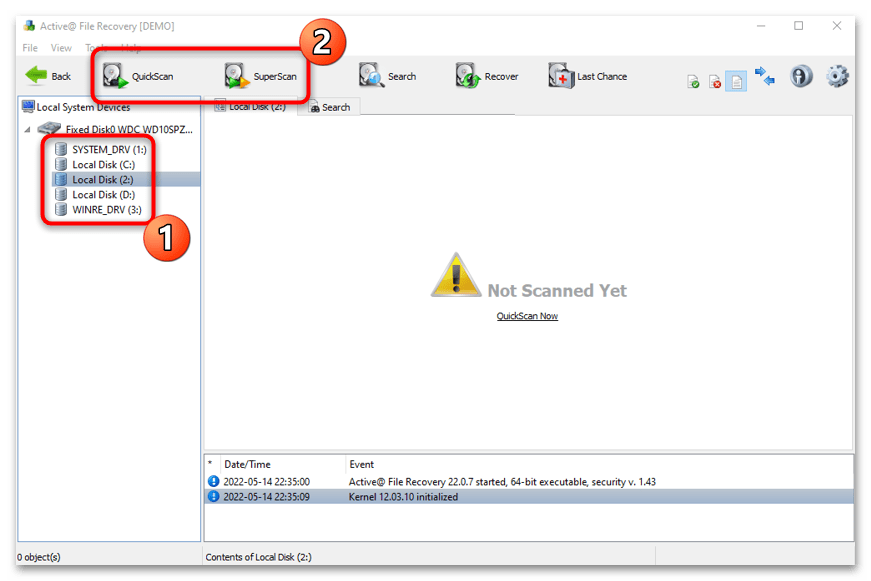 - После установки запустите программу. Отобразится интерфейс, где на панели слева необходимо выбрать локальный диск или носитель, который надо просканировать. Выделите его, затем нажмите на кнопку «SuperScan» вверху. Также доступна функция «QuickScan» для более поверхностного анализа.