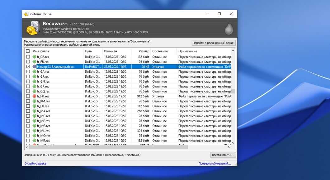 Выберите нужный файл, нажмите «Восстановить» и назначьте папку для возврата — очень рекомендуем выбрать другой диск. Программа может попробовать вернуть файл, даже если есть отметка «Утрачен». Это редко приводит к успеху. Иногда удаётся вернуть часть информации (актуально для текстов)