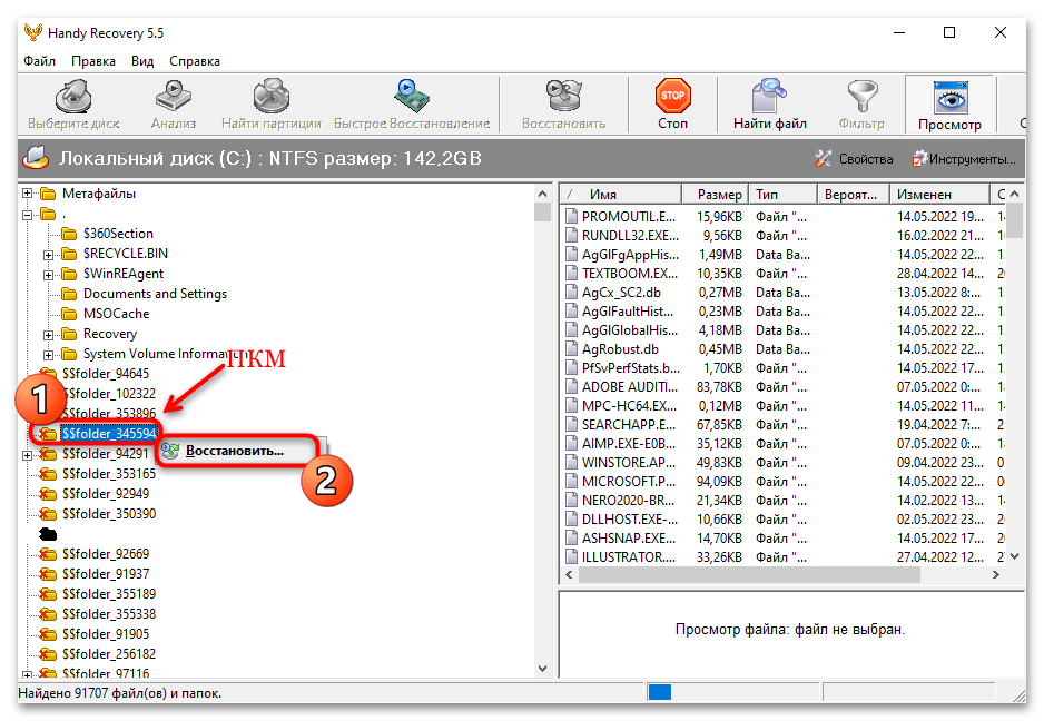 - На панели слева отобразятся найденные папки. Их имя может отличаться от того, что придумывали вы, но доступен просмотр содержимого в окне справа. Выделите нужную и щелкните по ней правой кнопки мыши. В появившемся окне нажмите на кнопку восстановления.