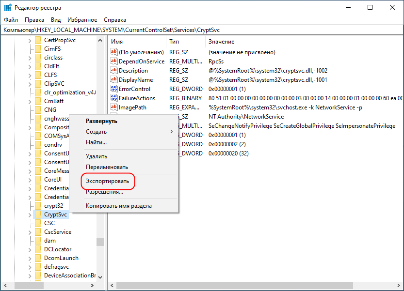 - В левой колонке отыщите подраздел CryptSvc, кликните по нему правой кнопкой мыши, выберите «Экспортировать» и сохраните ключ в виде REG-файла;