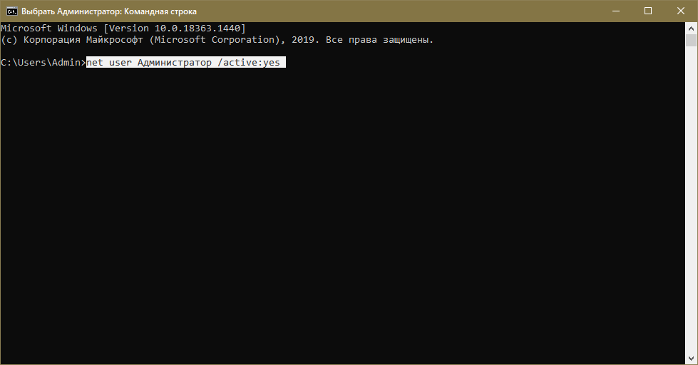 - Ввестив открывшемся окне «net user administrator», далее «active:yes».