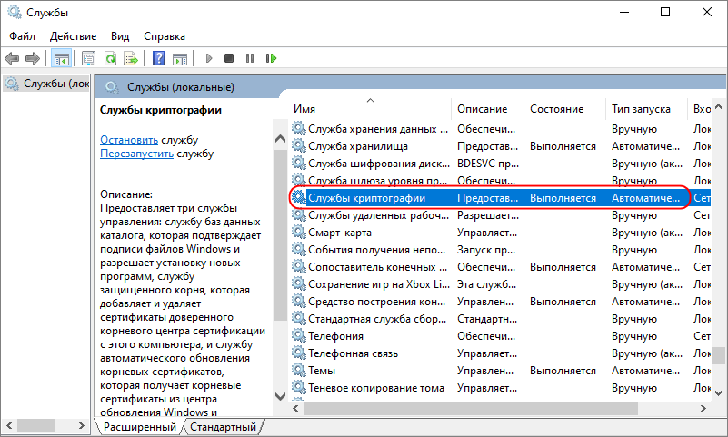 Еще одной причиной описываемой ошибки является повреждение ключей реестра важных системных служб, в частности, службы криптографии.