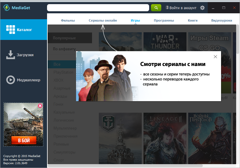 Одним из лучших аналогов uTorrent является MediaGet. Наряду с открытием торрент-файлов и загрузки через них различных материалов с ПК пользователей, это приложение предлагает собственный каталог контента, разделенный на категории, а также предоставляет возможность скачивать файлы на определенных веб-ресурсах или из каталога. Если воспользоваться последним вариантом, пользователь не увидит торрентов вовсе – существует кнопка загрузки, на которую следует нажать для того, чтобы контент начал скачиваться на ПК. Отпадает необходимость тратить время на сохранение отдельных торрент-файлов – они остаются в самом приложении.