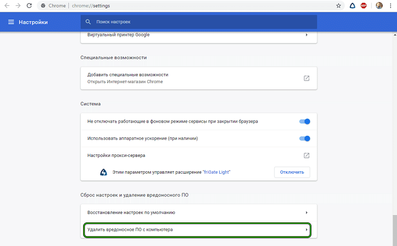 4. В Google Chrome: “Настройки” – “Дополнительно” – “Сброс настроек и удаление вредоносного ПО”. Запустите сканер.
