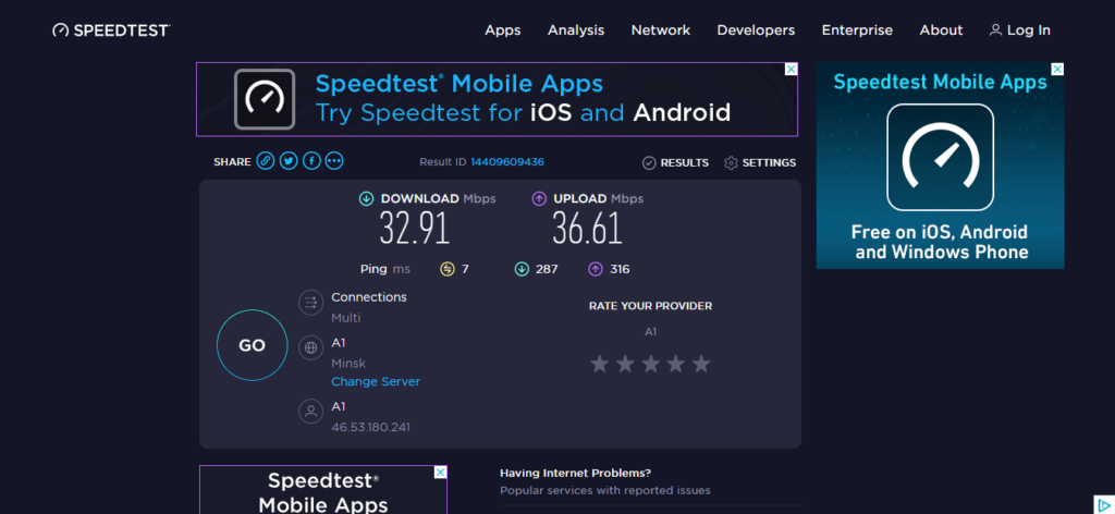 Тестирование лучше проводить несколько раз, при разных условиях: утром, когда сеть свободная, вечером (в час пик), в будние дни и в выходные. Значения, полученные после замера, сравниваются с теми, что указаны в вашем договоре с провайдером, или с теми, что есть в описании используемого вами тарифа.