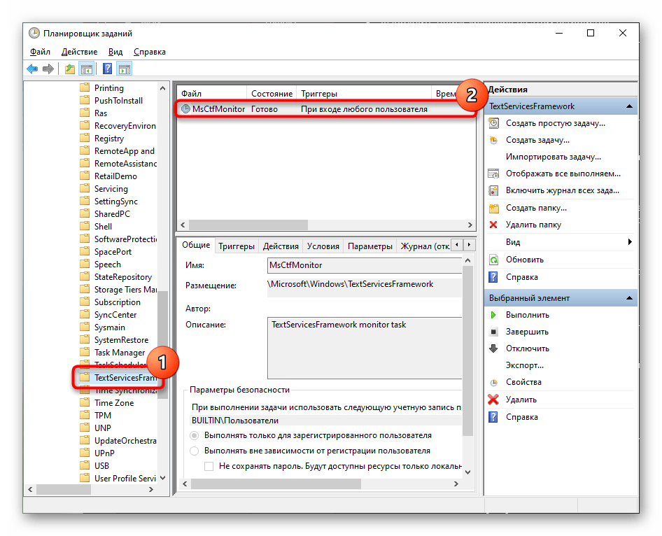 Опять же, через левую панель, разворачивайте папки «Библиотека планировщика» > «Microsoft» > «Windows» > «TextServicesFramework». В центральной части окна будет расположен параметр «MsCtfMonitor» — проверьте, чтобы его статус был «Готово».