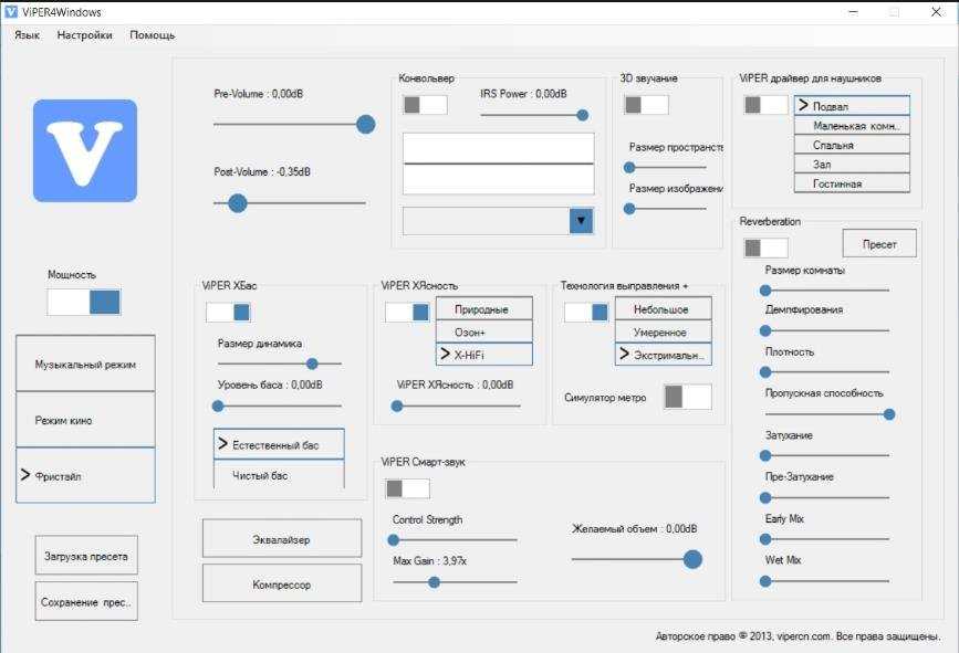 Глобальный эквалайзер Viper4Windows позволяет настроить объемное звучание, переключаться между режимами прослушивания музыки, просмотра кино или смешанным. Имеется встроенный компрессор, инструменты для усиления басов, контроля эха и так далее. К слову, программа имеет mobile-версию для Андроид Viper4Android.