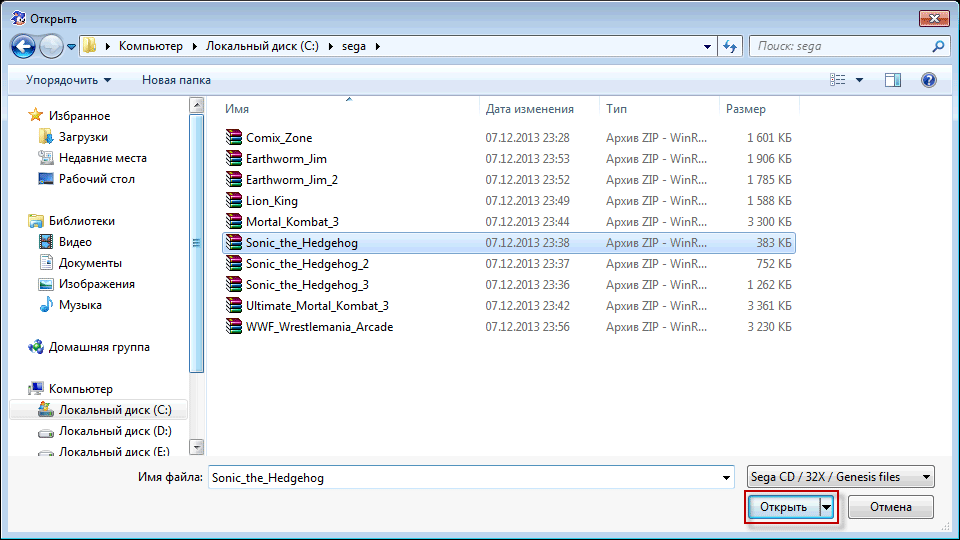 Независимо от того, где именно вы скачаете игру, она будет представлять собой архив, в котором лежит файл с расширением либо bin, либо smd, либо gen. Советую вам все скаченные архивы с играми скопировать в одну папку и хранить их в ней. Лично я создал у себя на диске С папку sega и в нее собрал все свои любимые игры Sega: