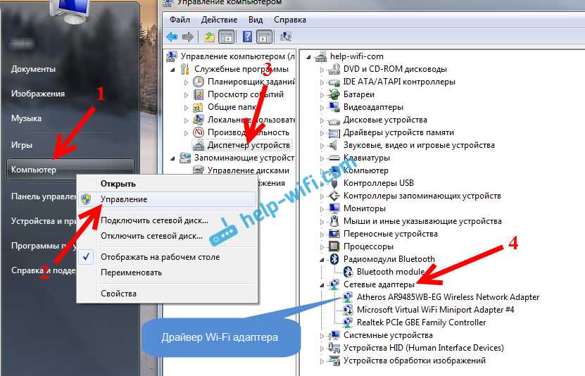 Что бы проверить, нам нужно зайти в диспетчер устройств. Откройте меню Пуск, нажмите правой кнопкой мыши на Компьютер, и выберите Управление. В новом окне перейдите на вкладку Диспетчер устройств. Откройте раздел Сетевые адаптеры, и посмотрите, есть ли там адаптер, в имени которого есть слова «Wi-Fi», или «Wireless». Выглядит это примерно вот так: