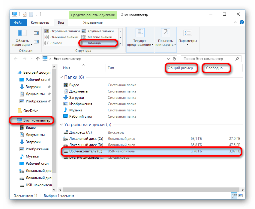 Бывает и такая ситуация, когда размер накопителя меньше, чем объем информации, которую планируется на него скопировать. Проверить это можно, открыв проводник в режиме таблицы. Там будут указаны размеры всех разделов с указанием их общего объема и оставшегося свободного места.