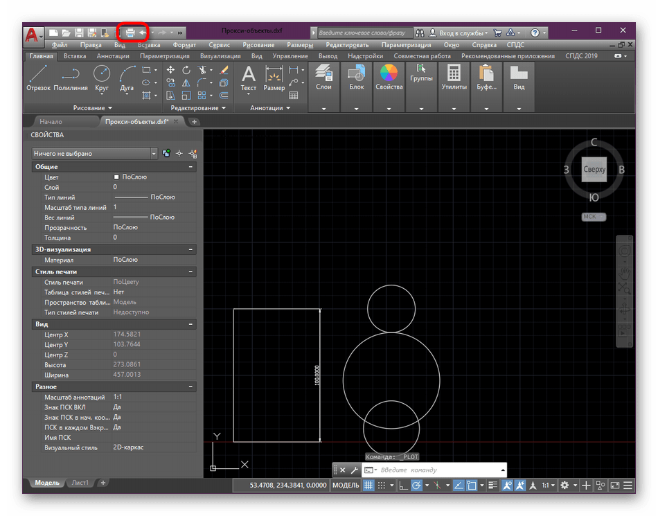- Зайдите в AutoCAD и через панель быстрого доступа перейдите в раздел «Печать». Сделать это можно и нажатием на горячую клавишу Ctrl + P.