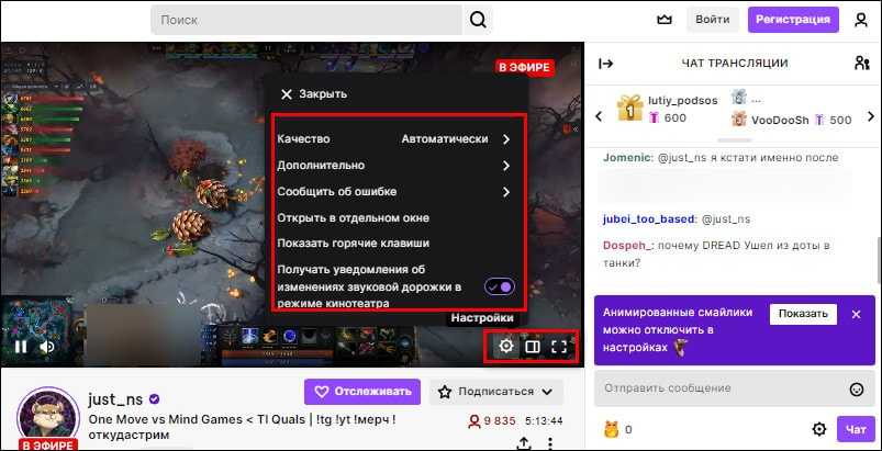Плеер Twitch имеет множество настроек. Помимо качества видео здесь можно указать задержку; включить мини-плеер, статистику видео и рекламу. Также есть режим кино. Справа от игрока находится сам чат.