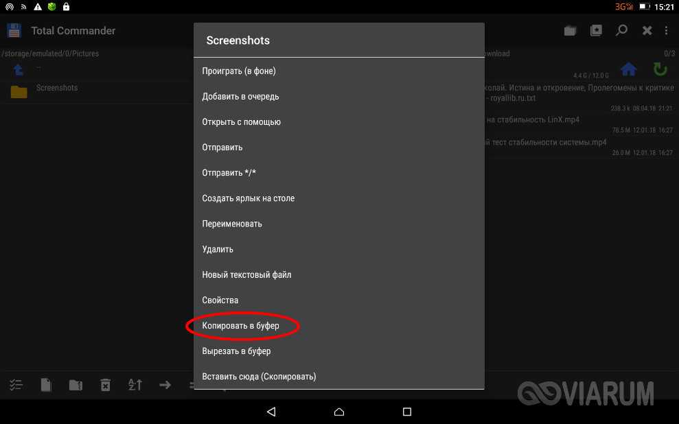 Чтобы скопировать или вырезать файл, нужно нажать на него, а когда появится контекстное меню, выбрать в нем опцию «Копировать в буфер» или «Вырезать в буфер».
