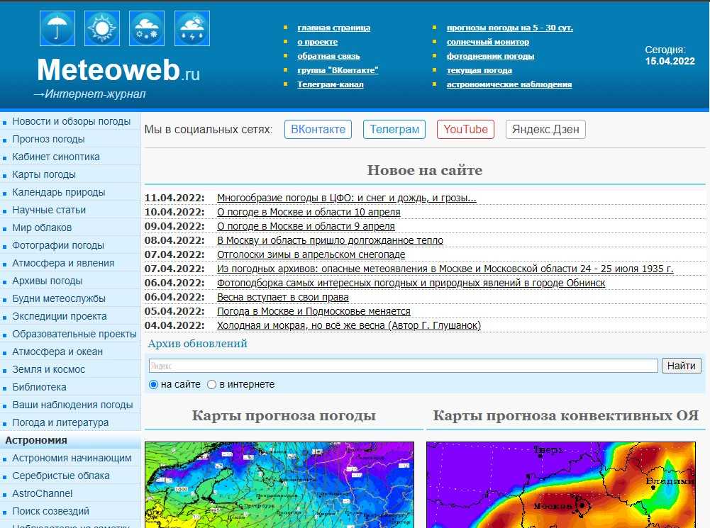 На ресурсе публикуется большое количество полезных сведений, статей от ученых-метеорологов, данные по астрономии. Именно здесь вы сможете почерпнуть много данных о природных явлениях, их специфике, источниках.