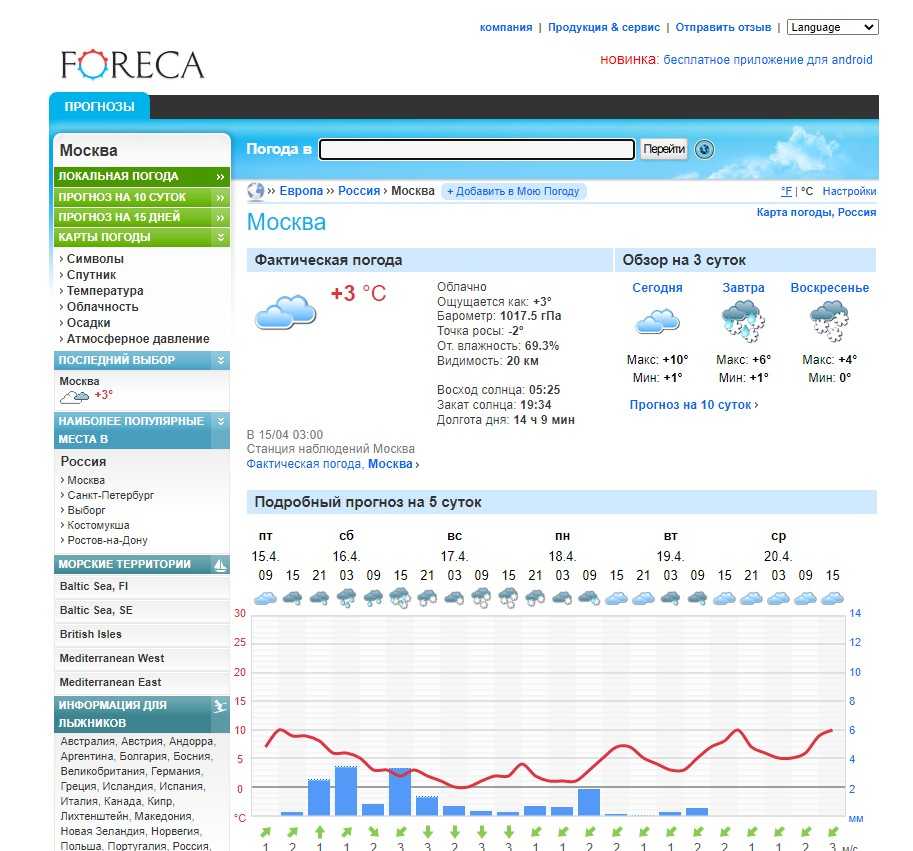 Это финский сайт, который поддерживается местной метеорологической службой. Это позволяет поставлять максимально точные прогнозы. Наиболее надежные сведения предоставляются на пять дней, далее уровень корректности становится значительно ниже.
