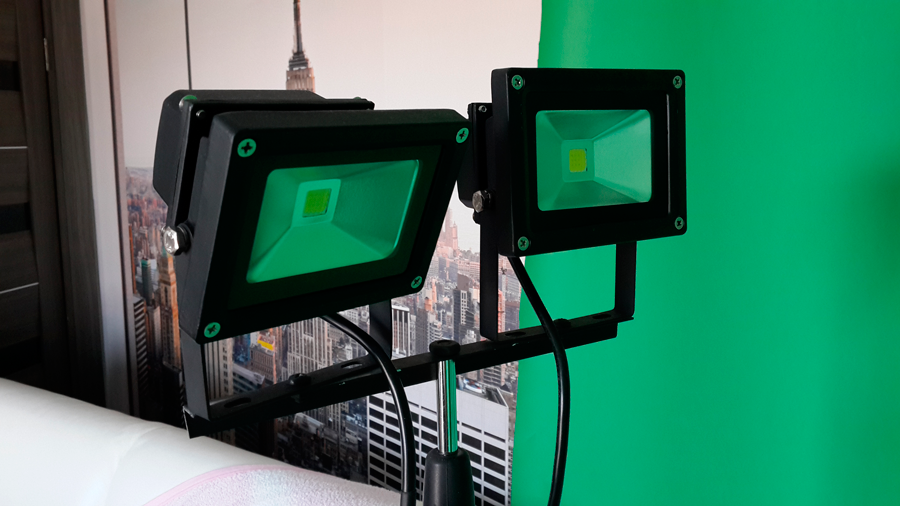 Для освещения хромакея в помещении потребуется минимум три источника света. Одну лампу следует установить таким образом, чтобы свет падал на объект съемки под углом 45 градусов. Вторую лампу лучше установить так, чтобы свет падал с другой стороны от объекта под углом 90 градусов. Часть этого света будет попадать на фон и уберёт тень на хромакее.