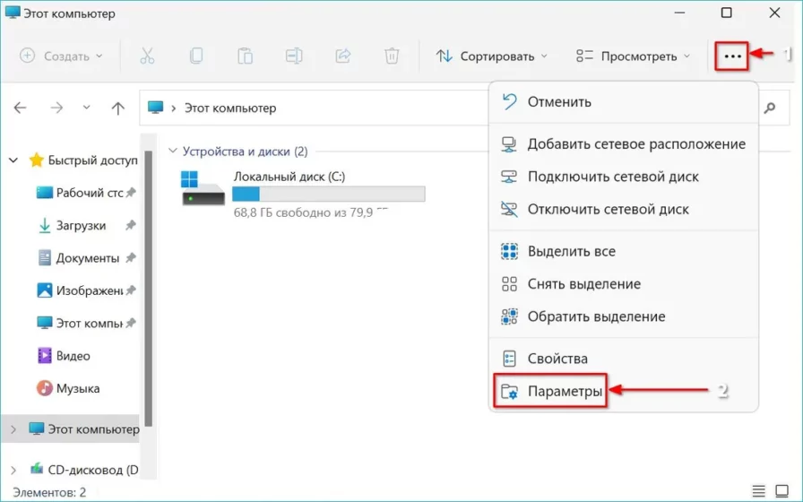 В «Проводнике» нажмите по кнопке с тремя точками справа вверху. Из появившегося меню выберите пункт «Параметры».