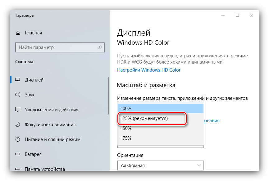 - Проделайте шаги 1-2 из предыдущего способа, но на этот раз найдите список «Изменение размера текста, приложений и других элементов». Как и в случае с разрешением, желательно выбирать параметр с припиской «(рекомендуется)».