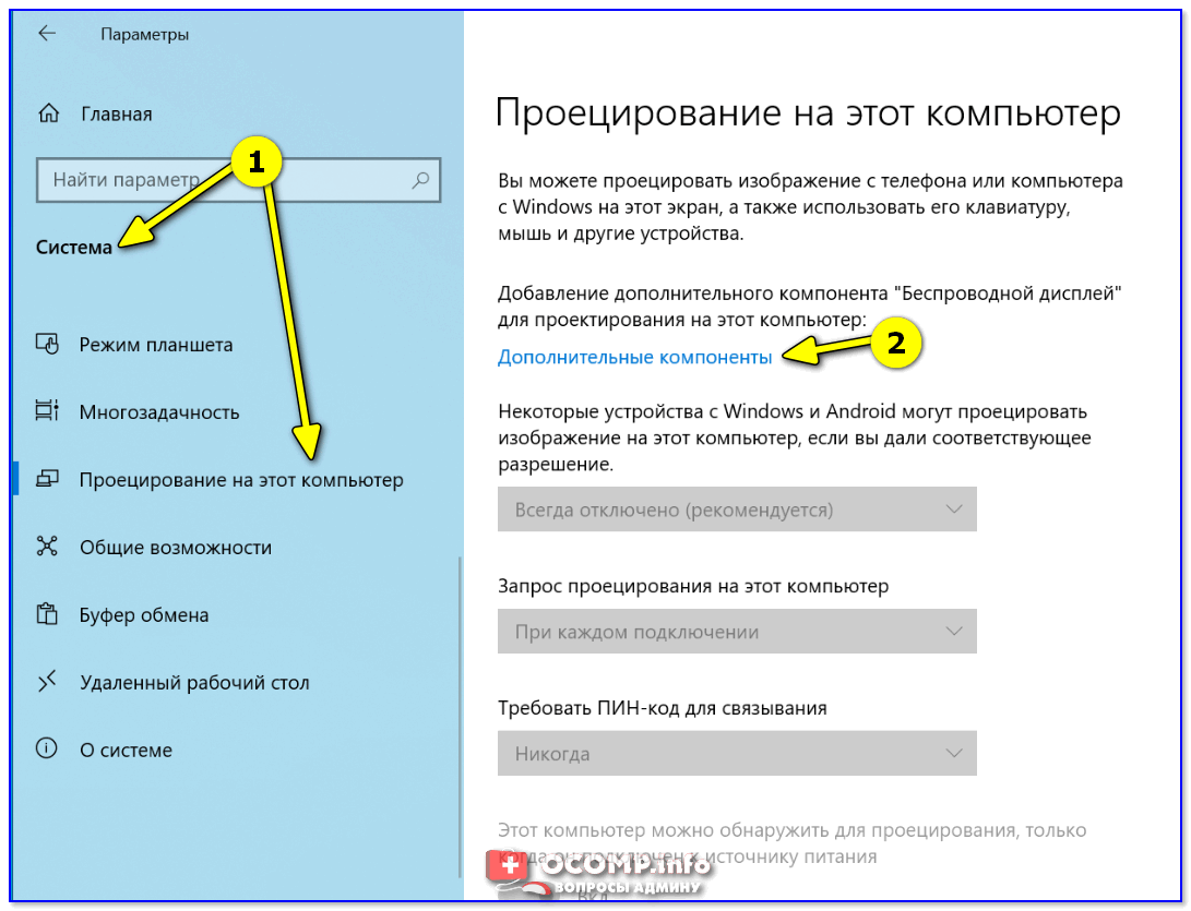 На Windows 10 существует более простой и доступный способ — с помощью параметра «Проецирование на этот компьютер» вкладки «Параметры» окна свойств экрана. Правда, работать он будет, только если ноутбук снабжен адаптером Wi-Fi с поддержкой Miracast (стандарт беспроводной передачи мультимедиа-сигнала). Зато использовать этот ноутбук в качестве монитора смогут не только другие компьютеры с Wi-Fi-модулями под управлением Windows 10, но и любые другие устройства, поддерживающие технологию Miracast — экран ноутбука появится у них в списке доступных беспроводных экранов.