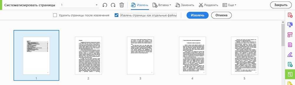 Также можно извлекать любые страницы, выбирая их миниатюры на панели навигации Acrobat слева.