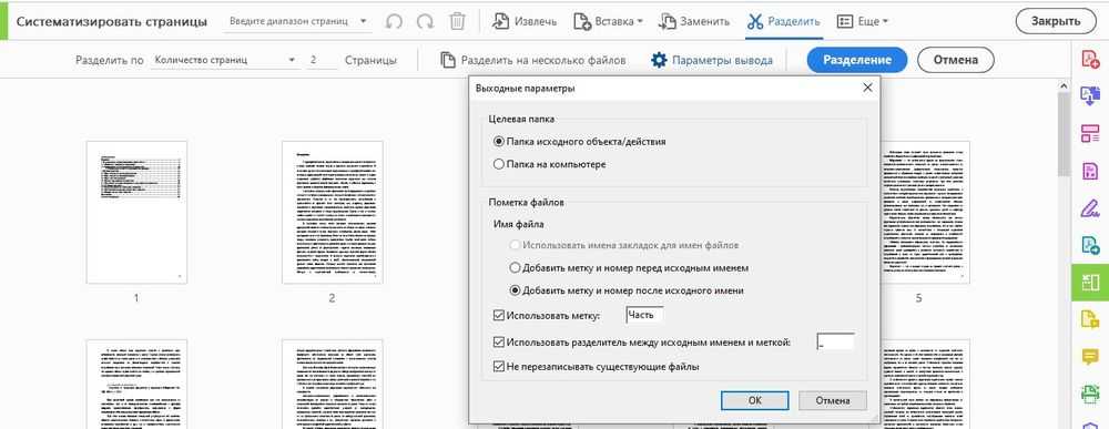 Можно разделить один или несколько файлов PDF на документы PDF меньшего размера. При разделении документа PDF можно задать разбиение по максимальному количеству страниц, максимальному размеру файла или по закладкам верхнего уровня.