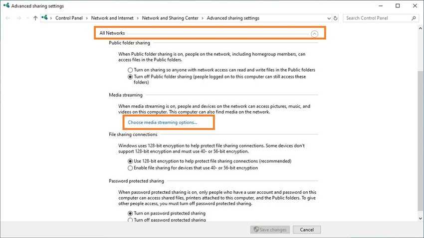 Выберите «Пуск» > «Параметры» и нажмите «Сеть и Интернет» в окне «Параметры Windows». В следующем окне щелкните «Центр управления сетями и общим доступом» на правой панели, затем откройте раздел «Изменить дополнительные параметры общего доступа» и разверните параметр «Все сети». Щелкните «Выберите параметры потоковой передачи мультимедиа» в разделе «Потоковая передача мультимедиа», нажмите «Включить потоковую передачу мультимедиа» в следующем открывшемся поле и нажмите ОК, чтобы ваш компьютер мог передавать мультимедиа на устройства, подключенные к локальной беспроводной сети. После завершения настройки закройте все окна и переходите к следующему шагу.