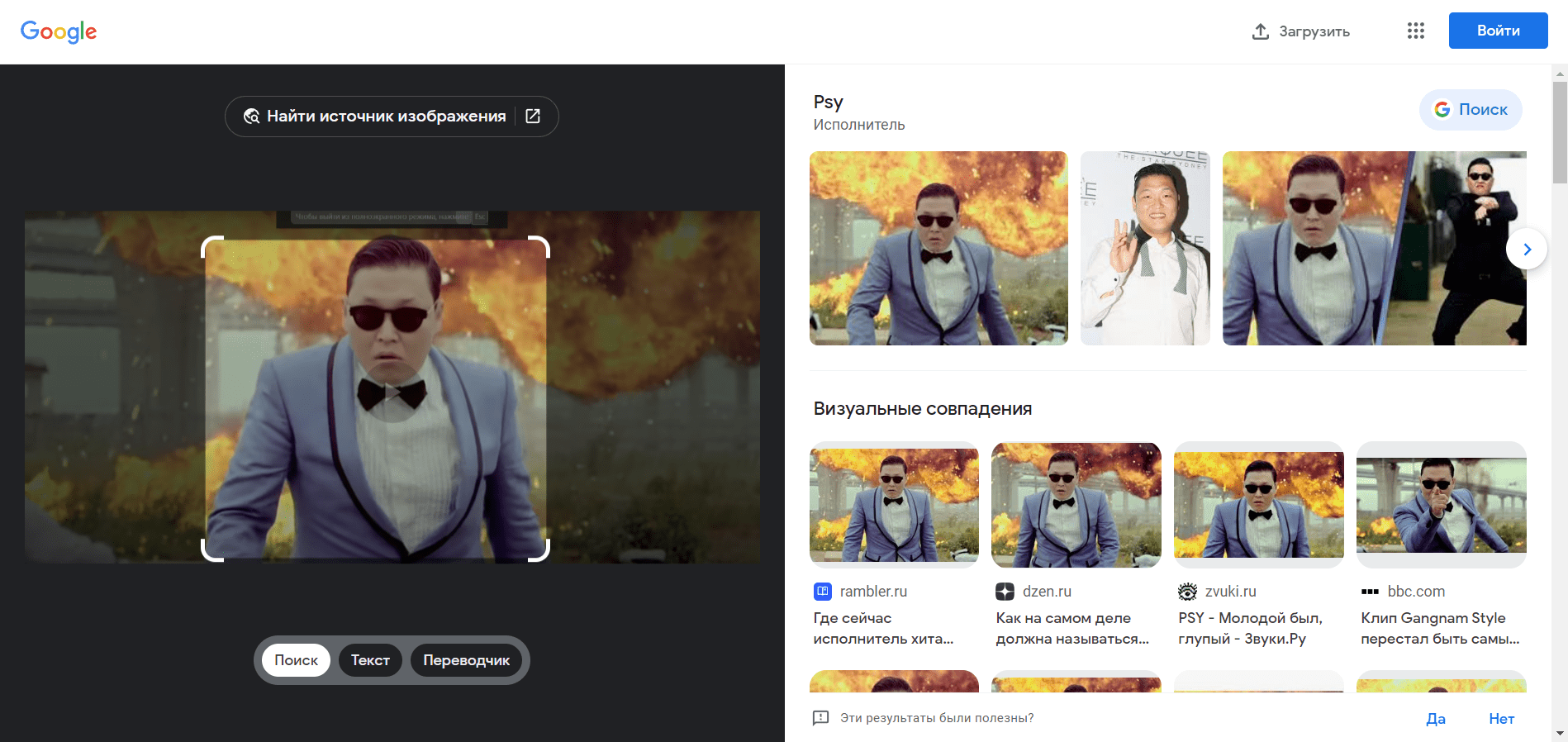 Как видно из примера выше, мы загрузили изображение песни Gangnam Style, и поиск Google выдал информацию об исполнителе — а также статьи и новости о клипе. Таким образом, вы можете искать по названию музыкальных клипов, фильмов, смешных роликов и другого видеоконтента.