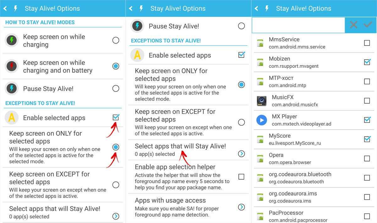 Чтобы отключить тайм-аут для всей системы, кроме определенных приложений, выберите «Keep screen on EXCEPT for selected apps», откройте список программ (нажмите «Select apps that will Stay Alive!») и отметьте нужные.