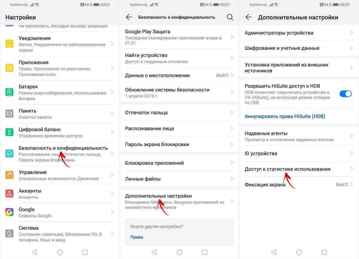 На смартфонах Huawei и Honor, чтобы разрешить программе Stay Alive! отслеживать, какие приложения вы используете, откройте меню настроек и перейдите в раздел «Безопасность и конфиденциальность» → «Дополнительные настройки» → «Доступ к статистике использования». Выберите Stay Alive! и активируйте тумблер «Отслеживать использование».