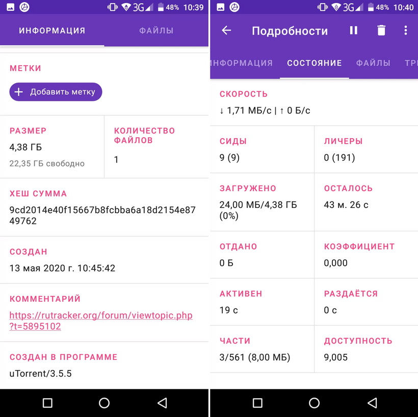 В общем, сначала убедитесь, что файл поместится на устройстве, и только потом скачивайте его. Также нужно убедиться в том, что устройство не разряжено. BitTorrent покажет, когда аппарат пора подзаряжать.