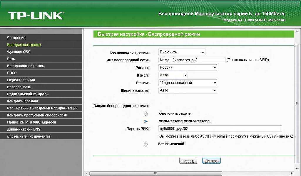 В данной ситуации актуален именно этот вариант, т. к. маршрутизатор действительно не синхронизирован с ПК. Перейти к настройке Wi-Fi. Для этого необходимо ещё раз развернуть вкладку «Быстрая настройка», а затем выбрать подпункт «Беспроводной режим». В следующем окошке потребуется задать имя для точки доступа, выбрать тип защиты, придумать пароль для подключения и указать смешанный режим вещания. После того как нужные строки будут заполнены, останется кликнуть по кнопке «Далее»