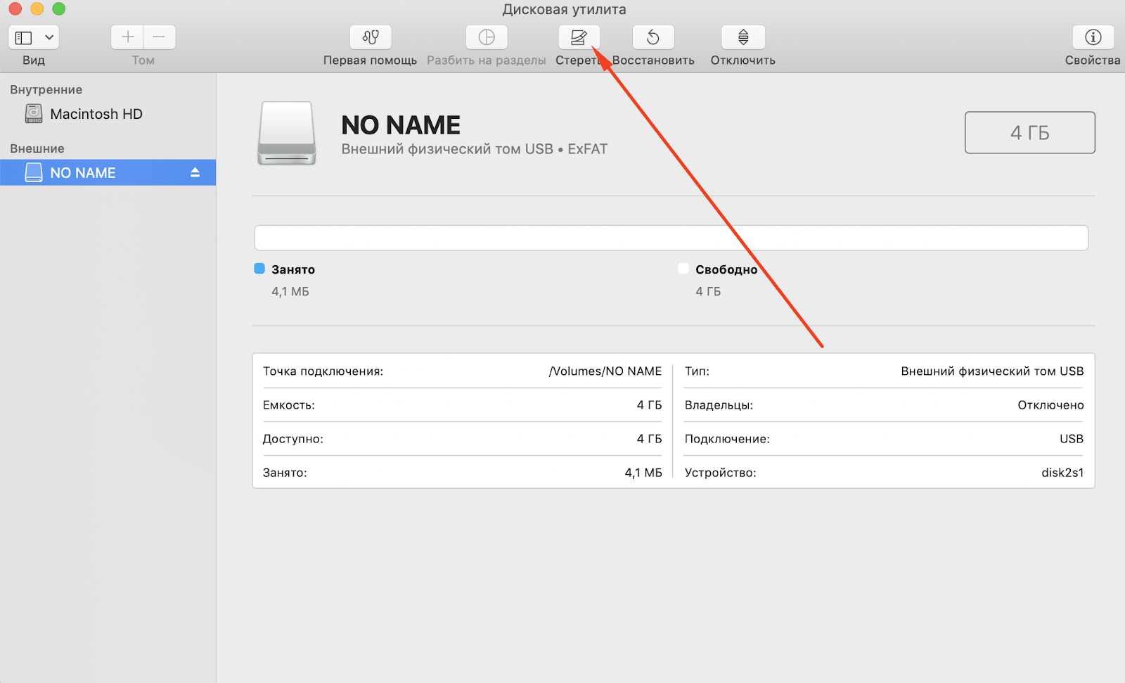 5. Для форматирования нужно выбрать нужное устройство, а затем нажать «Стереть» в верхней панели».