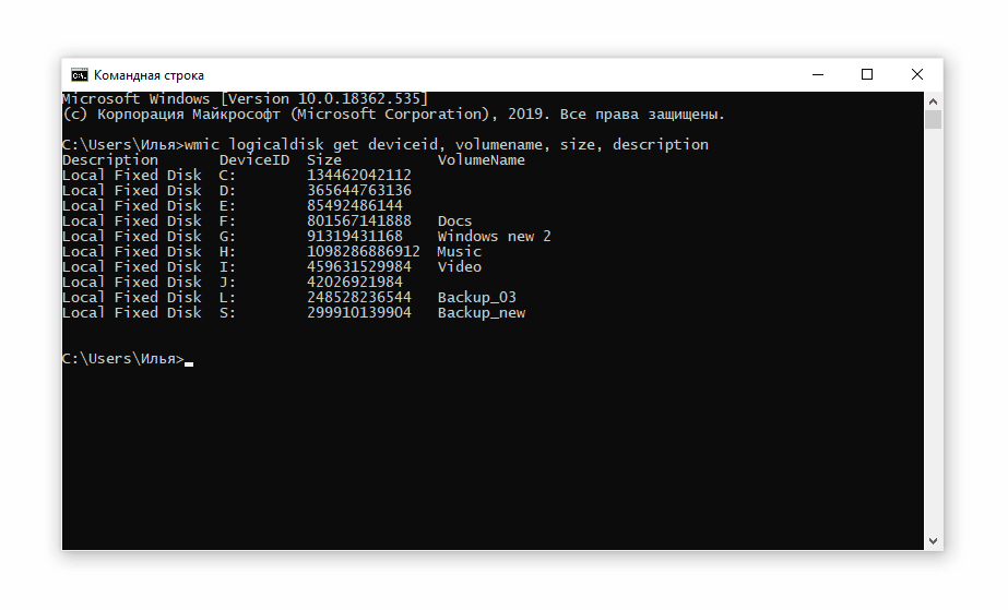 wmic logicaldisk get deviceid, volumename, size, description