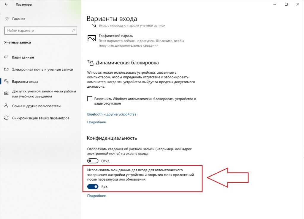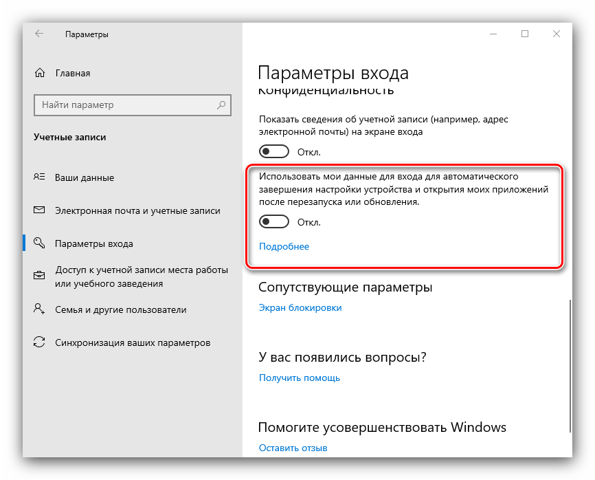 В правой части окна, прокрутив его вниз, находим переключатель “использовать мои данные для входа для автоматического завершения настройки устройства и открытия моих приложений после перезапуска или обновления” и отключаем его.