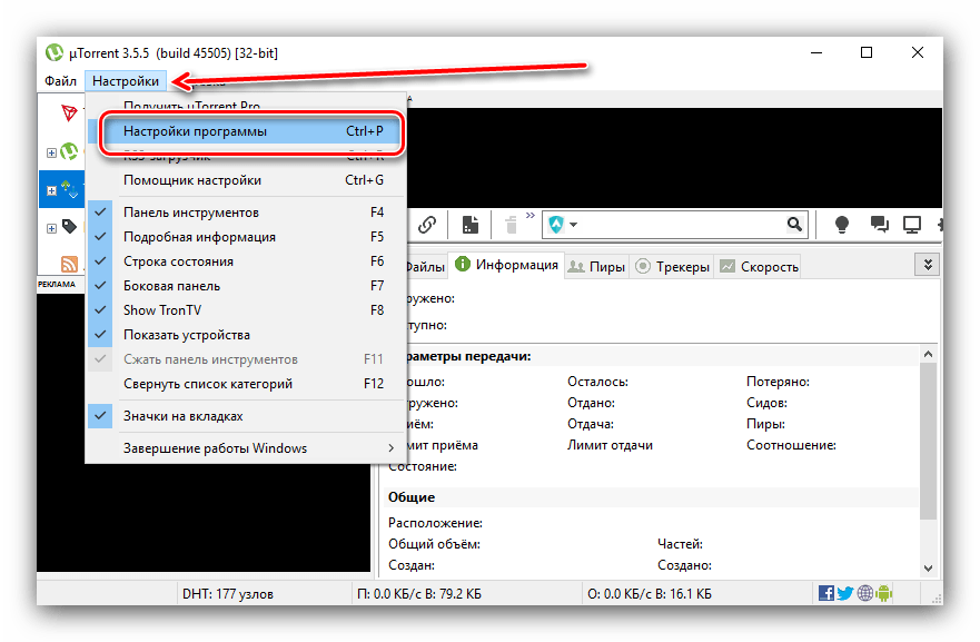 - Откройте Настройки программы uTorrent нажав сочетание клавиш Ctrl+P или выберите соответствующий пункт в меню.