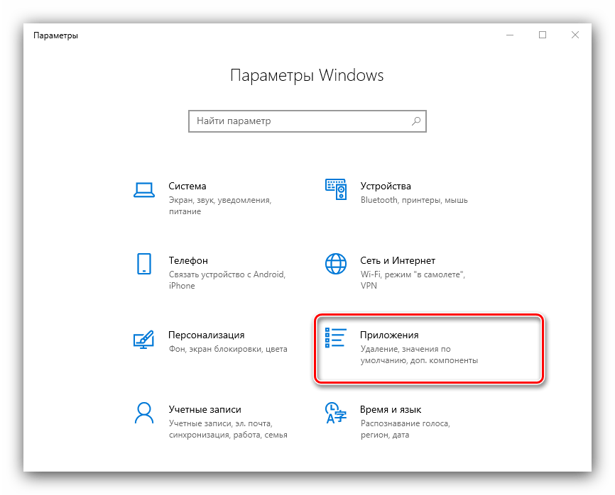 - Откройте «Параметры» сочетанием клавиш Win+I. Выберите пункт «Приложения».