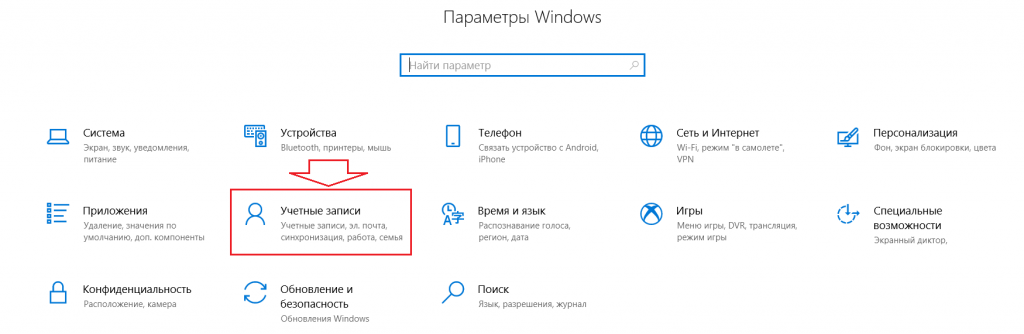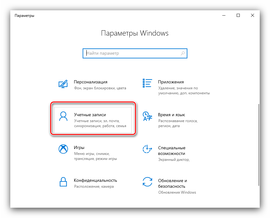- Откройте «Параметры» и воспользуйтесь пунктом «Учётные записи».