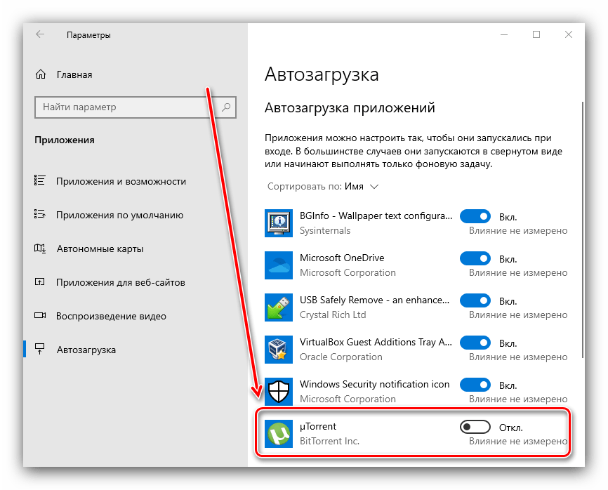 - Найдите в списке программ uTorrent и переключите значение автозагрузки программы в положение Отключено.