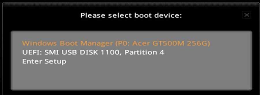 Boot Menu представляет из себя небольшое окно, в котором при помощи мышки (стрелок на клавиатуре) вы сможете выбрать устройство, с которого произвести загрузку. Пример такого меню показан на рис. 3.