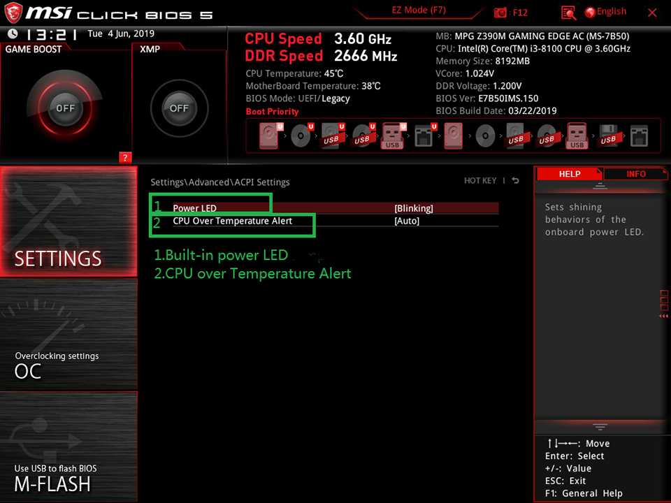 Настройка индикатора питания и извещений о высокой температуре процессора.