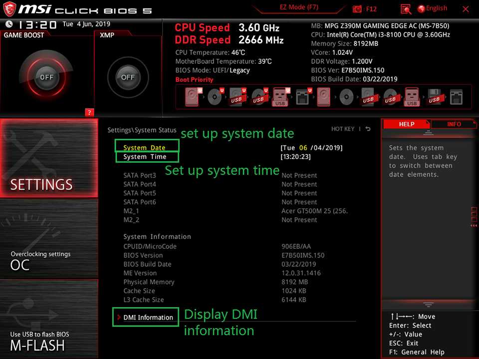 Настройка системных даты и времени, идентификация накопителей, сведения об интерфейсе DMI.