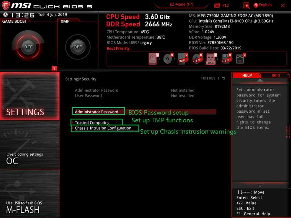 Пароль для интерфейса BIOS, настройки TPM-модуля, извещение об открытии корпуса компьютера: