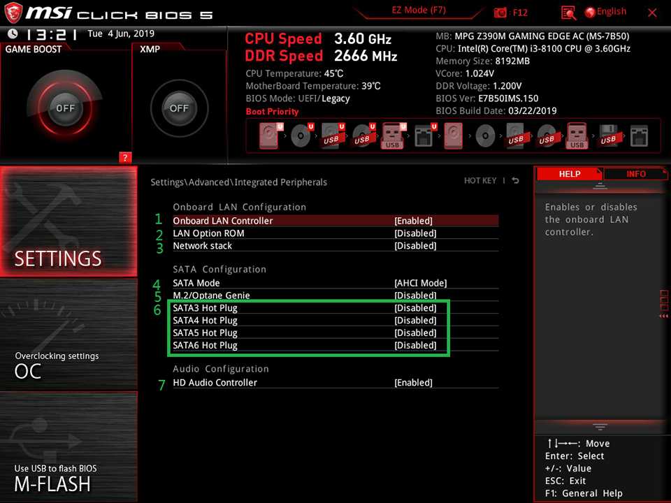 Настройки встроенных контроллеров (сеть, SATA, звук).