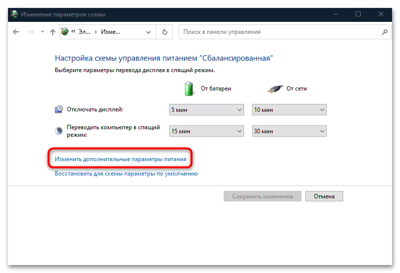 Чтобы изменить настройки существующего плана, откройте Панель управления -> Электропитание. Напротив активного плана (выделен радиокнопкой) нажмите Настройка плана электропитания -> Изменить дополнительные параметры питания.