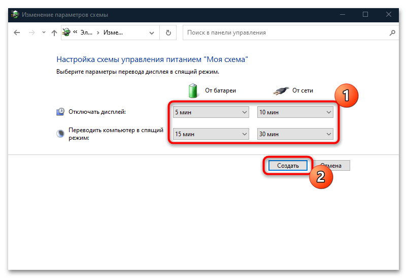 Выберите параметры для перевода системы в режим сна, затем кликните по «Создать».