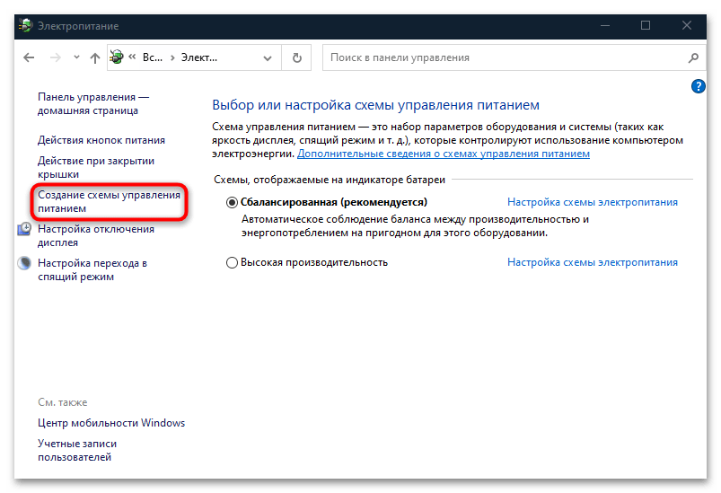 - Щелкните по пункту «Создание схемы управления питанием» на левой панели.